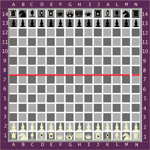 Rappelons qu’ en deçà de la ligne frontière d’assaut des pions ( ligne rouge ) , les pièces simples (non étoilées) comme la Tour , le Fou , la Dame , le pion ou le Roi , ont le même comportement qu’aux échecs classiques par contre le Cavalier est ici , le Cavalier Arabe (CA) c’est à dire , à la fois , un Cavalier ancien (CavalierTour) et un Cavalier nouveau ou un CavalierFou , qui se déplace , en T , sur les diagonales .